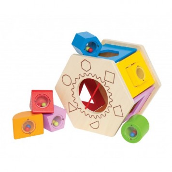 Bead-filled blocks add a new dimension of play to this multi-tasking shape sorter. Shake a block. Ask your child to imitate the sounds you made with his or her own block.