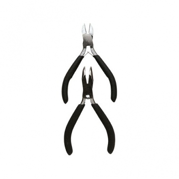 Set de dos alicates, uno de corte y otro de punta fina y curva para tareas relacionadas con coger, doblar, colocar y cortar piezas de maquetas u otros objetos de tamaño reducido. Estas herramientas de modelismo u otras manualidades como los trabajos con electricidad y electrónica sirven para lo siguiente: el alicate de corte facilita el corte de multitud de objetos con una absoluta precisión; el alicate de punta fina y curva permite sujetar piezas de maquetas pequeñas, además de torcer cables e hilos. Fabricados en metal de alta calidad para su durabilidad, los alicates disponen de mango ergonómico y apertura automática.
