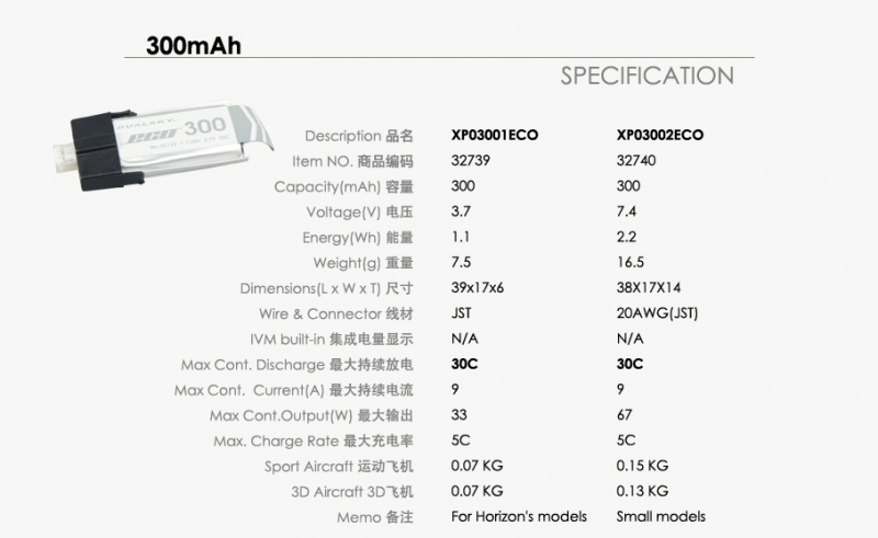 DUALSKY XP03001ECO LIPO BATTERY 300MHA 3.7V 25C
