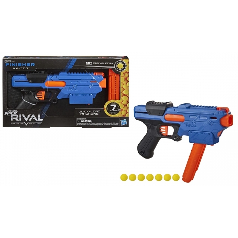 El lanzador Nerf Rival Finisher propone un cargador de recarga rápida y una tapa corrediza que se abre completamente para que recargues múltiples proyectiles muy rápido. Saca el cargador vacío, cárgalo con proyectiles y colócalo en el lanzador, ¡y vuelve a la batalla! También puedes recargar los proyectiles por la parte de arriba del cargador, ¡así que tienes 2 maneras de recargar! Mueve el mango hacia atrás y adelante para preparar el lanzador y aprieta el gatillo para lanzar 1 proyectil de espuma. Incluye 7 proyectiles Nerf Rival oficiales, un seguro de gatillo para impedir lanzamientos accidentales y un riel táctico. Este lanzador es compatible con todos los cargadores Nerf Rival, pero el cargador de recarga rápida no es compatible con todos los lanzadores Nerf Rival. Dimensiones del Packaging: 6 x 43 x 25 cms aprox. No requiere pilas.