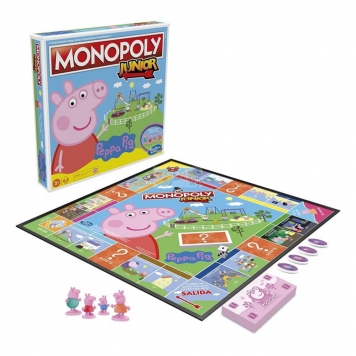 Monopoly Peppa Pig, Aprende a ganar con Peppa y su familia. En este juego de mesa Monopoly Junior, los niños pueden imaginar ser parte del mundo feliz y divertido de Peppa Pig. Los jugadores se mueven alrededor del tablero como Peppa Pig, George Pig, Mummy Pig o Daddy Pig. Los más pequeños pueden practicar contando dinero mientras mueven su ficha de Monopoly alrededor de la tabla comprando las propiedades. El jugador con más dinero en efectivo al final gana. Este regalo no requiere pilas.