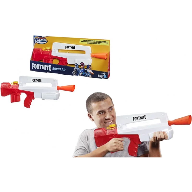 Hasbro Nerf Supersoaker fortnite burst ar, El lanzador de agua está inspirado en el equipo usado en Fortnite, ¡reproduciendo el aspecto del que aparece en el popular videojuego! Diviértete mientras empapas a todos los que están a tu alcance con una gran ráfaga de agua. El lanzador Nerf Super Soaker garantiza la diversión en las fiestas al aire libre y en los juegos de verano. Es fácil de llenar y lanzar, ¡así que todo el mundo puede divertirse empapando! Abre la tapa, llena el tanque con agua y cierra la tapa. ¡Ahora apunta y empapa! Divertido para todos y genial para los coleccionistas de Fortnite y los fans de Nerf Super Soaker. Medidas: 21x6x61 cm. Este regalo no requiere pilas.