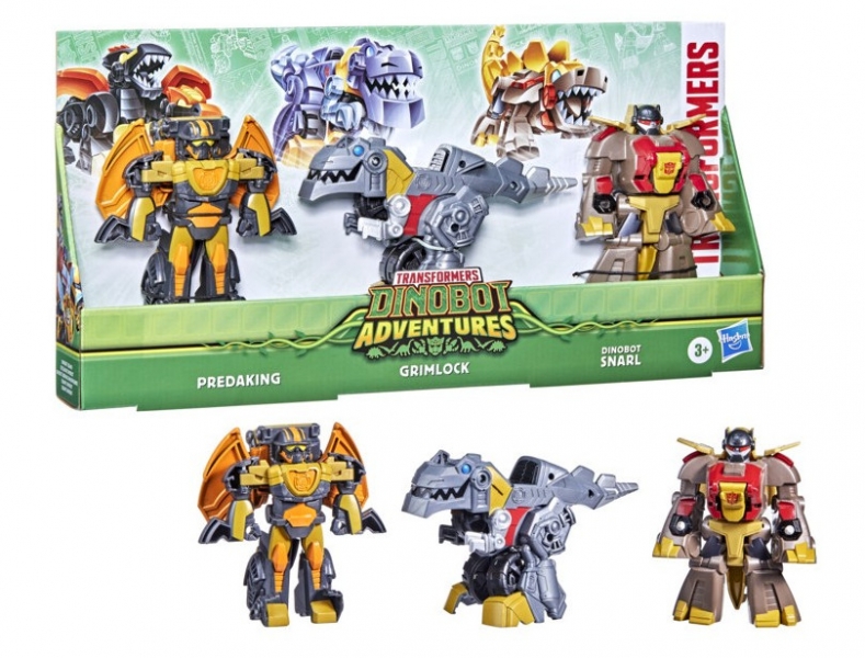 Transformers Aventuras Dinobot, Los Dinobots entran en acción pisando fuerte, masticando y rugiendo. Este set presenta a Grimlock y sus amigos Dinobots, además de los personajes Autobot favoritos con modos alternativos de dinosaurio reimaginados. Los pequeños pueden disfrutar de 2 modos de juego, convirtiendo la Figura de Acción de Grimlock de Tiranosaurio Rex a modo de motocicleta, la Figura de Acción de Dinobot Snarl de robot a modo de Estegosaurio, y la Figura de Acción de Predaking de robot a modo de dragón y viceversa en 1 sencillo paso. Medidas: 11 cm las figuras. Este juguete no requiere pilas.
