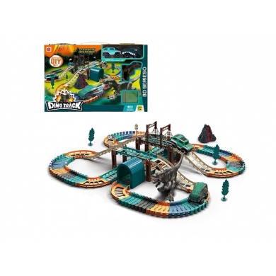 Aventura mundial de dinosaurios, este juego de pistas es un tema marcial con vehículos militares, órbitas verdes y dinosaurios que pueden organizarse para disfrutar de la aventura del ejército y la diversión de las carreras. Mira el coche de carreras a batería corriendo por la pista que creaste, volando alrededor de las curvas, corriendo sobre el elevador, bajando el puente, corriendo por la puerta doble, encontrándose con los dinosaurios. ¡Qué aventura tan emocionante!. Medidas packaging 28x7.2x43.2 cms. Utiliza 2 pilas AA incluidas.