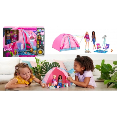 Barbie Vamos a Acampar, Dirígete al aire libre con este juego Barbie viene con su propia tienda de campaña y toneladas de accesorios temáticos. Decorada con un toldo y luces de cadena, la tienda de campaña de tela extra grande tiene espacio para cuatro muñecas. Puedes armar un campamento y luego representar historias de campamentos de noches estrelladas con sillas plegables, un telescopio, una hoguera, asadores de malvaviscos, un juego de cartas y más. Este juguete no requiere pilas.