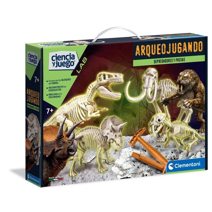 Este kit científico te permitirá descubrir los secretos del pasado. Excava en los bloques de tierra como un paleontólogo de verdad y reconstruye el esqueleto fosforescente de 2 dinosaurios (el T-Rex y el Triceratops) y el de 2 animales prehistóricos (el Mamut y el Smilodon). Recrea la batalla entre los depredadores y sus presas y estudia las características de estos animales legendarios extinguidos. Edad recomendada: 7+ Tamaño de caja: 42 x 29 x 6.7 Peso: 2439 gr Baterías requeridas: NO