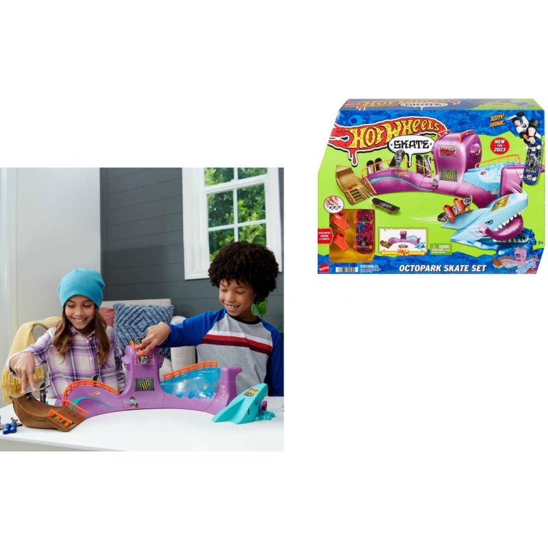 Hot wheels skatepark de pulpo, ¡Deslízate por las barandillas y haz trucos chulísimos con el conjunto de skate Octopark de Hot Wheels Skate!. El conjunto de juego con temática de pulpo incluye barandillas, rampas verticales, escaleras, una rampa tipo bowl y plataformas para disfrutar de múltiples superficies sobre las que patinar y jugar sin límites. ¡Incluso hay un tiburón con función devoradora que se activa con la tabla!. Medidas: 77 cm. Este regalo no requiere pilas.