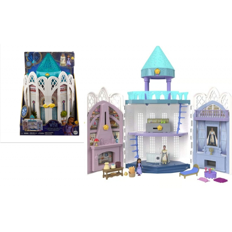 Disney wish castillo de magnifico, Ingresa al castillo del Rey Magnífico con el juego Castillo Wish Rosas de Disney. Los fanáticos pueden darle vida a la película con los minimuñecos del Rey Magnífico y Asha, 20 accesorios para contar historias, juego de 360 grados, cinco áreas de juego y toques mágicos que incluyen tres revelaciones de estrellas como la chimenea, el laboratorio del Rey Magnífico, su retrato lenticular y una increíble ¡Proyección luminosa de un cielo nocturno estrellado! La casa de muñecas Rosas Castle, que captura el corazón y la diversión de la película musical animada, Medidas: 6 x 10 cm. Este juguete incluye pilas AAA .