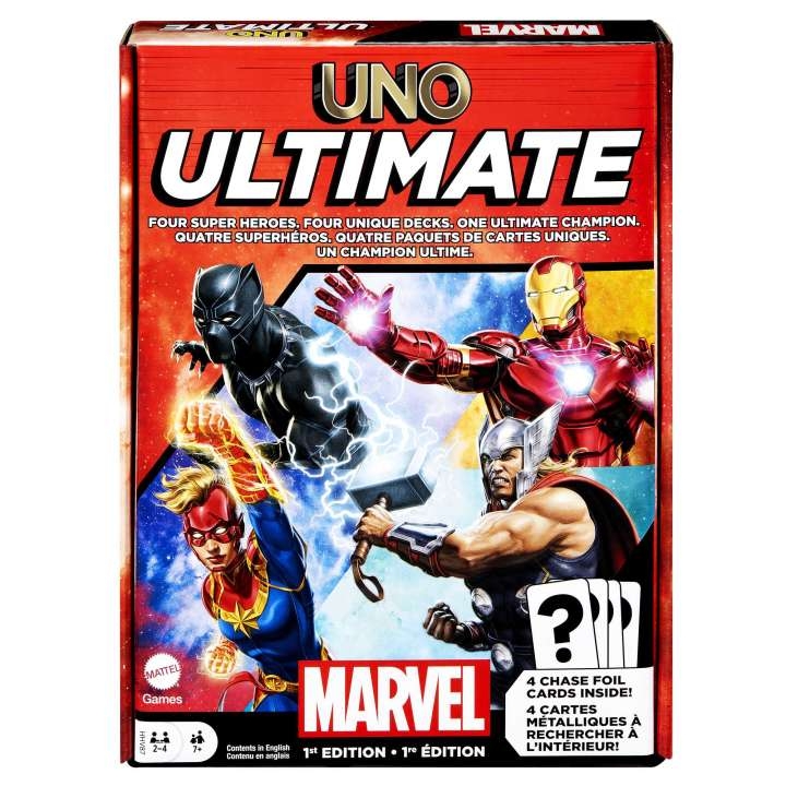 Con este juego de cartas UNO Ultimate™, los jugadores pueden no ser superhéroes de Marvel, ¡pero pueden jugar como lo son! Esta versión premium de UNO® incluye cuatro mazos de cartas, cada uno diseñado específicamente para un personaje heroico y popular. Cada jugador elige jugar como un personaje que tiene poderes especiales que puede usar en CADA turno. ¡Un mazo de peligro contiene cartas de 'Evento' y 'Enemigo' para cambiar el equilibrio de poder! Los jugadores corren para deshacerse de todas sus cartas como en el clásico juego UNO®, y no pueden olvidar gritar '¡UNO!' cuando falta el último. ¡Exclusivo de UNO Ultimate™ son DOS formas de ganar cada ronda, así como cuatro cartas foil coleccionables nunca antes vistas que los jugadores pueden conservar y coleccionar o poner en el juego mismo para darle vida al mazo Ultimate! El juego de cartas es un gran regalo para los fanáticos de UNO®, Marvel y la diversión en la noche de juegos.