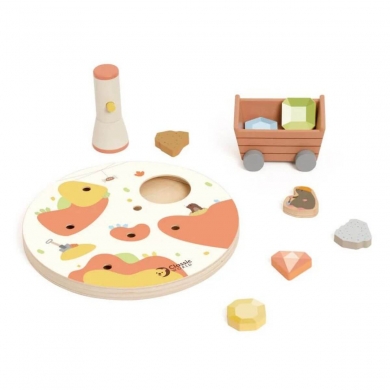 Vayamos a la búsqueda del tesoro, encendamos la linterna (en realidad es un imán, no emite luz) y excavemos en busca de un tesoro, recogiendo las gemas brillantes excavadas en el carro de la mina. Una excelente manera de inspirar el interés de los niños y niñas en las aventuras al aire libre.
