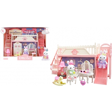 Set Dormitorio Familia Conejo, Este precioso set de juego incluye un dormitorio de dos plantas, con adorables figuras de conejito, muebles y encantadores accesorios como un tocador, un armario y un divertido tobogán. El dormitorio, con detalles exquisitos, incluye un encantador vestidor con ropa en miniatura, un tocador con accesorios y un ambiente cálido y acogedor para una diversión sin fin. Sus materiales de alta calidad y seguros para niños garantizan su durabilidad, lo que lo convierte en un regalo maravilloso para los más pequeños. ¡el complemento perfecto para su mundo imaginativo!. Medidas: 42x19x28 cm. Este regalo no requiere pilas.