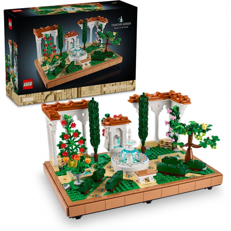 Inspirado en la belleza y la diversidad de la arquitectura del paisaje, este modelo de la colección Jardines del Mundo tiene una fuente escalonada, una pila con detalles artísticos, caminos de baldosas decorativas y parras en flor que adornan pérgolas de columnas blancas con tejas rojas. El jardín incluye parras, 2 cipreses, un geranio rojo, petunias blancas, hibisco rojo, buganvilla rosa y caléndulas, además de figuras de animales (pájaro, rana y polilla luna).