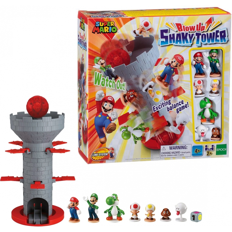 ¡Mantén a salvo a Super Mario, Luigi y sus amigos en el nuevo Blow Up! Shaky Tower! Tira el dado y coloca al personaje en las plataformas de la torre. ¡Cuidado! Cada figura tiene un peso distinto y balanceará la torre de un lado a otro. ¡Si despiertas a Bowser la bola caerá haciendo volar a todos los personajes!