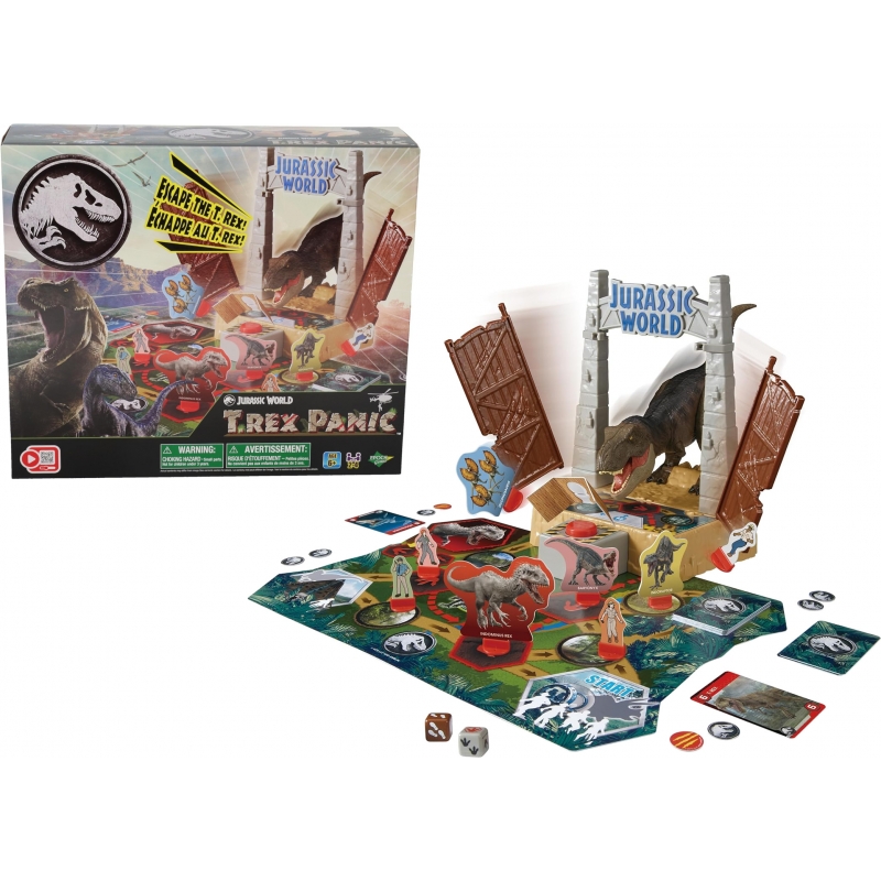 ¡Explora Jurassic World con T. Rex Panic de EPOCH Games! ¡Sigue los dados y mueve tus piezas antes de que los dinosaurios te ataquen! ¡Intenta escapar de los dinosaurios en las aventuras! No son solo los dinosaurios los que intentan atacarte... ¡Cuidado con el T. Rex! Escóndete en el retrete cuando te encuentres con dinosaurios. Pulsa el botón hasta que llegue el helicóptero de rescate. ¿Podrás escapar del mundo de Jurassic?