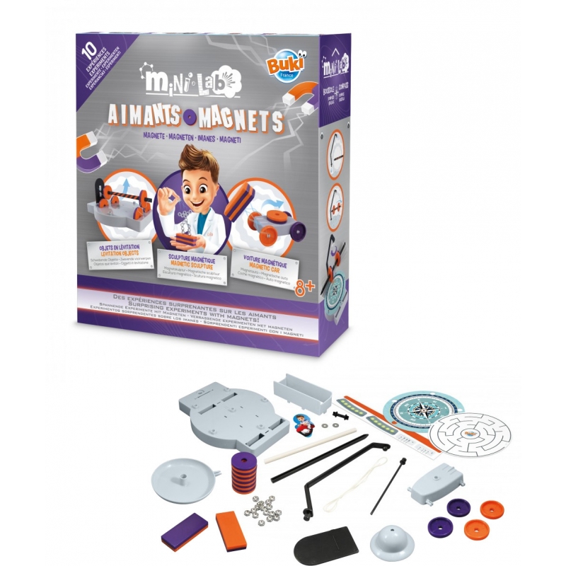 Buki Mini Laboratorio de Imanes, 10 experimentos para descubrir las fascinantes propiedades del magnetismo. Construye objetos que leviten, un auto magnético y contruye una brújula y muchos proyectos mas, todos ocupando las propiedades de los 8 imanes que trae el kit. Medidas: 20x6x21 cm. Este regalo no requiere pilas.