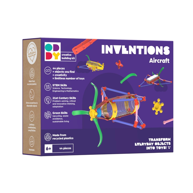 Convierte objetos cotidianos en invenciones con el kit de construcción creativo ecológico Oddy Inventions. Este innovador juego de construcción de juguetes permite a los niños/as reciclar artículos como botellas de plástico y coladores, transformándolos en vehículos imaginativos con ruedas, helicópteros, poleas, ruedas de ferris y otros mecanismos.
