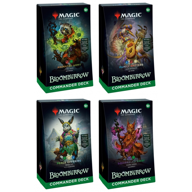 En Bloomburrow, el Valle se ve amenazado por fuerzas elementales desatadas, y la salvación recae sobre sus protectores más pequeños. Lucharás junto a ratones, ranas, murciélagos, pájaros y un sinfín de otras criaturas para restaurar la paz y demostrar que la valentía no tiene límites. En Commander, cuatro jugadores se unen para demostrar su fuerza y estrategia, y solo uno se alzará con la victoria. Cada mazo de Commander Bloomburrow™ de 100 cartas, listo para jugar, permite a los aficionados de Commander empezar a jugar de inmediato.