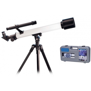Telescopio ASTROLON 288x con trípode de aluminio, Telescopio con trípode de aluminio y funda de transporte. Lente objetivo de 1.969 in de diámetro, distancia focal de 19.685 in, dos oculares intercambiables, lente Barlow 2.3. 0.236 x 0.984 in Finderscope, visor diagonal, Star Wheel Gráfico. Trípode de aluminio de 35.0 in, robusto estuche de transporte. La serie de ciencia óptica de EDU anima a los niños inquisitivos a explorar el mundo de la ciencia; Medidas 53 x 12.5 x 28 cm. Este regalo no requiere pilas.