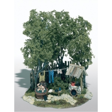 Incluye una cerca de madera, el tendedero, la ropa, una casa de pozo, cuatro árboles, follaje, la base y piezas variadas. Esta escena está diseñada para encajar en nuestra cúpula y base de exhibición de vidrio.