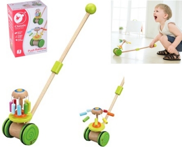 Permite desarrollar la coordinación y el equilibro de los más pequeños/as con este juguete para empujar de hermoso diseño. Empuje la flor del arco iris y observe cómo los pétalos danzantes se abren, florecen y giran. Producto de material noble madera.No requiere pilas.