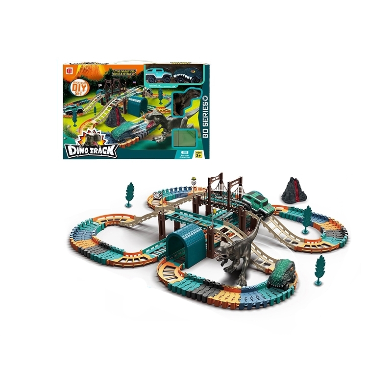 Aventura mundial de dinosaurios, este juego de pistas es un tema marcial con vehículos militares, órbitas verdes y dinosaurios que pueden organizarse para disfrutar de la aventura del ejército y la diversión de las carreras. Mira el coche de carreras a batería corriendo por la pista que creaste, volando alrededor de las curvas, corriendo sobre el elevador, bajando el puente, corriendo por la puerta doble, encontrándose con los dinosaurios. ¡Qué aventura tan emocionante!. Medidas packaging 28x7.2x43.2 cms. Utiliza 2 pilas AA incluidas.