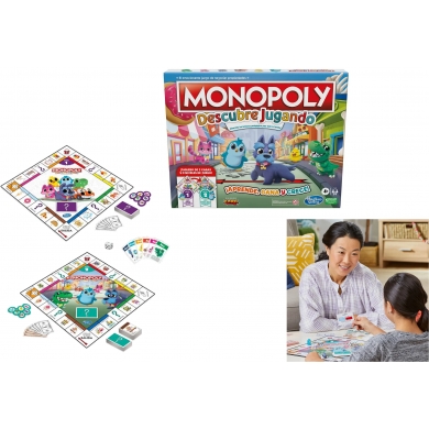 Hasbro Monopoly discover, Aprende, gana y crece: es un juego que crece con los niños. El juego de mesa Monopoly Discover presenta herramientas de enseñanza divertidas para familias. 2 niveles de juego: el tablero de juego de 2 caras ofrece 2 niveles de juego: un lado se centra en contar y combinar para niños pequeños. Dale la vuelta a la tabla para un enfoque en la lectura y matemáticas simples para niños grandes. Adorables fichas monopolio: a los niños les encantará usar las fichas Monopoly: pingüino, coche, pato, escocés, avellana y Rex. 2 juegos de dinero y tarjetas: cada nivel incluye su propio juego de dinero y tarjetas Monopoly, adecuado para ese nivel. Este regalo no requiere pilas.