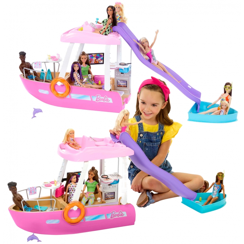Barbie Bote de los Sueños, ¡Vive aventuras en alta mar con este barco de ensueño de Barbie! Con más de 20 piezas y seis áreas de juego diferentes, que incluyen una piscina y un tobogán, el juego Barbie Dream Boat está hecho para la diversión con temática oceánica. Además, con tres pies de ancho y un pie de alto, ¡hay mucho espacio para que la muñeca Barbie invite a sus amigos y se divierta bajo el sol!