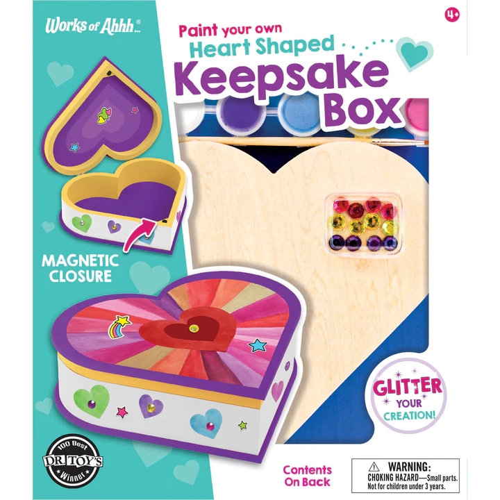 ¡Este kit de pintura y artesanía en madera con caja de recuerdos en forma de corazón está hecho de madera real e incluye todo lo que necesitas para crear una hermosa obra de arte! ¡El kit de pintura y manualidades de madera Heart Keepsake Box es el regalo perfecto para todos los niños amantes del arte! Incluye 1 caja de recuerdos de madera con bisagras en forma de corazón, 12 piedras preciosas, 1 hoja de pegatinas, 1 hoja de plantilla, 1 esmalte brillante no tóxico, 5 botes de pintura acrílica no tóxica, 1 pincel de punta plana con calidad de artista y 1 hoja de instrucciones. Con guía de pintura.
