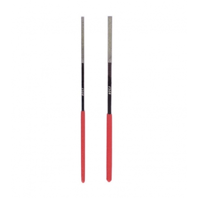 Juego de dos limas de diamante de precisión en forma de cuña de 3 y 5 mm de ancho (200 mm de largo). Ideales para los detalles más pequeños, su forma de cuña las hace perfectas para trabajar pequeñas grietas o surcos. Cuentan con un mango ergonómico.