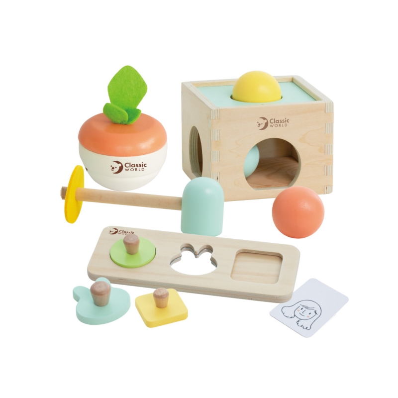 Se trata de un kit de regalo para bebés a partir de 6 meses, que aprovecha su imparable curiosidad por el mundo, Incluye un picafuerte con bolas y martillo, un puzzle encajable de formas y un mordedor, Los bebés podrán desarrollar la exploración visual y las habilidades motoras finas,