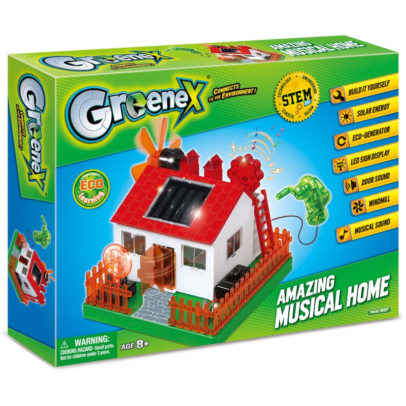 - Casa musical solar fácil de construir - La casa musical solar funciona con luz solar natural o con un generador - Observa cómo la magnífica casa cobra vida con la pantalla LED solar para letreros; sonido solar para puertas; molino de viento solar; sonido musical solar; pantalla LED para letreros; sonido de puerta con generador; molino de viento con generador; sonido musical con generador - ¡Disfruta escuchando música en la casa en cualquier lugar y en cualquier momento! - Requiere 2 pilas “AA”