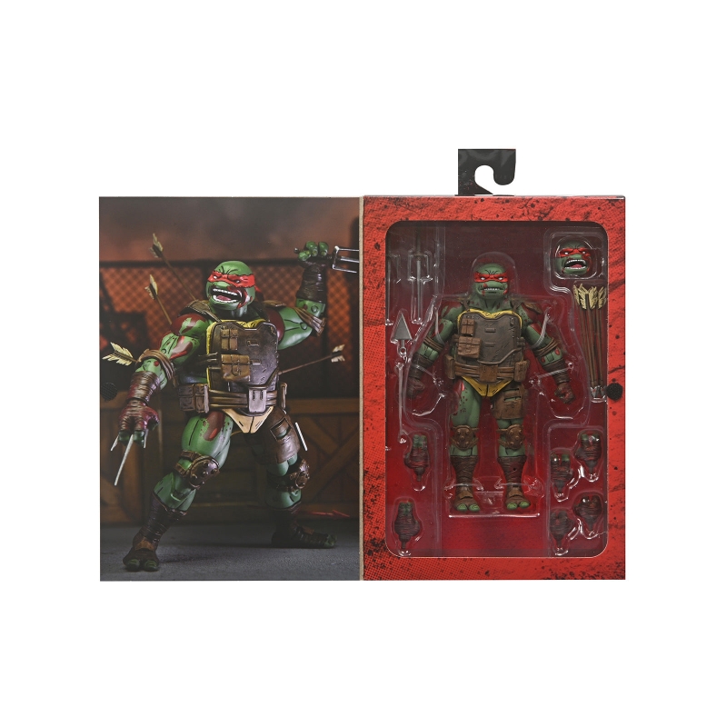 De la serie de cómics de las Tortugas Ninja, ¡El Último Ronin! En una ciudad de Nueva York futurista, muy distinta a la que conocemos hoy, una Tortuga solitaria y superviviente emprende una misión aparentemente desesperada para obtener justicia para su familia y amigos caídos. Basada en el número 2 del cómic, esta figura representa la última batalla de Raphael contra el malvado Clan del Pie y presenta una decoración dañada por la batalla.