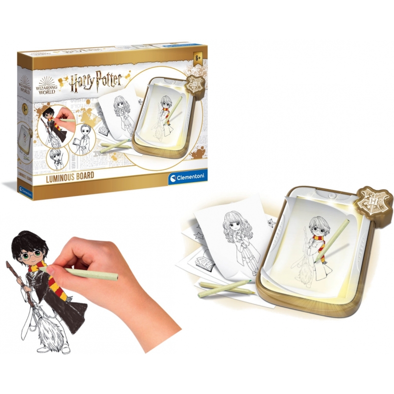 Clementoni Harry Potter Luminous Board, ¡Una pizarra de luz mágica para seguir las "trazas" de Harry Potter y los personajes que pueblan su mundo!. Light Blackboard es perfecto para rastrear fácilmente las imágenes de Harry Potter, los diferentes personajes y escenarios que actúan como telón de fondo para su mundo en las hojas de dibujo. Simplemente inserte los dibujos con las imágenes de Harry Potter en la pizarra brillante y luego coloque una hoja de dibujo vacía sobre él para seguirlos fácilmente. Medidas: 45x31x7 cm. Este regalo incluye pilas.