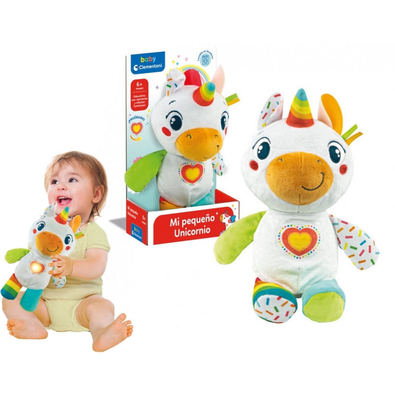 Clementoni Mi pequeño unicornio, Un unicornio supersuave que divertirá y enseñará a los niños mientras se abrazan y juegan. Al presionar el botón central, se reproducirán melodías y canciones para estimular al niño e introducirle en el mundo de las letras, sus primeras palabras, primeros números y colores. Los diferentes tejidos y elementos susurrantes estimulan el desarrollo multisensorial del bebé. Un personaje dulce y simpático para abrazar y llevar siempre contigo. Los niños se conectarán rápidamente con este adorable unicornio y su linda carita, y creará un vínculo emocional de afecto y empatía. Medidas: 17x27x8 cm. Este regalo incluye 3 pilas LR44.