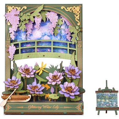 Disfruta de esta reinvención de las pinturas clásicas de Monet de Rowood. El Nenúfar Brillante es un rompecabezas de madera en 3D que se transforma en un encantador adorno de mesa con una cálida iluminación.