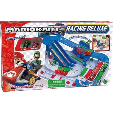 Inspirado en el mundo de Mario Kart, ¡el Mario Kart Racing Deluxe cuenta con 6 obstáculos y contador de vueltas! Conduce rápidamente usando los 3 botones incluidos. ¡El primero en dar 5 vueltas gana!